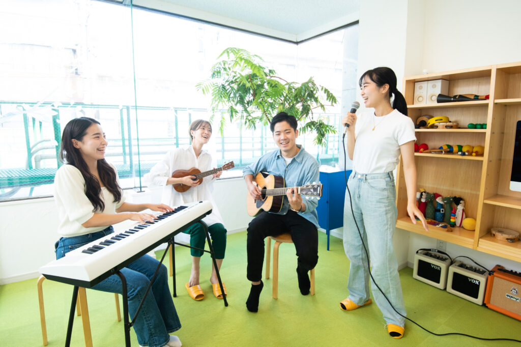 防⾳練習室を無料で利⽤できるほか、ギターなどの楽器も並⾏して学べたり、グループレッスンや発表会、交流会などのイベントも盛ん。